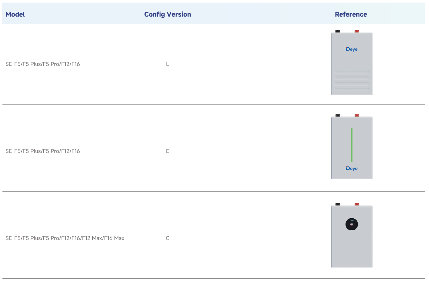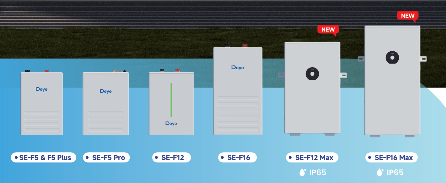 لا تزال بطارية Deye's SE-G5.1 Pro-B منتشرة على نطاق واسع في أوروبا كبطارية حامل بقدرة 5.12 كيلووات في الساعة. يحتفظ الطراز SE-F5 Pro الأحدث بنفس بنية 51.2 فولت/100 أمبير في الساعة، ولكنه يحول المنتج نحو التثبيت على الحائط/الأرضية/المكدس ويضيف وحدة مراقبة WiFi/Bluetooth اختيارية داخل النظام البيئي SE-F.