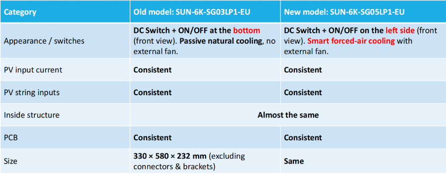 يعكس الانتقال من الطراز القديم (SUN-6K-SG03LP1-EU) إلى الطراز الجديد (SUN-6K-SG05LP1-EU) تحسينات في التبريد وتصميم واجهة المستخدم، مع إضافة تبريد الهواء القسري وتخطيط مفاتيح يسهل الوصول إليه. تعمل هذه التغييرات على تحسين أداء العاكس وسهولة استخدامه. ومع ذلك، يحتاج القائمون على التركيب إلى مراعاة تأثير الضوضاء المحتمل الناتج عن المروحة الخارجية الجديدة وضمان الخلوص المناسب لتدفق الهواء بكفاءة. تظل المكونات والأبعاد الكهربائية الأساسية دون تغيير إلى حد كبير، مما يضمن الاستمرارية والتوافق في التركيبات.